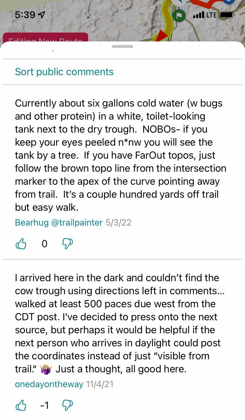 Last night, as soon as I crested the plateau I searched for a camping spot. The ground was solid rock, sandstone. I found sand drifted behind a juniper and tried to erect my tent, but the sand was only an inch or two deep. My tent stakes would not go in. So I picked up my gear in my arms and wandered a couple hundred feet to where the sand was deeper, found a flat spot nestled between prickly pear cactus and set up, the front stake of my tent imbedded in the middle of a cactus. I had enough water for dinner and the night, but only about two cups by the time morning came. There was a sketchy water source 0.3 miles up the trail which I planned to hit first thing. Here is what FarOut hikers reported: