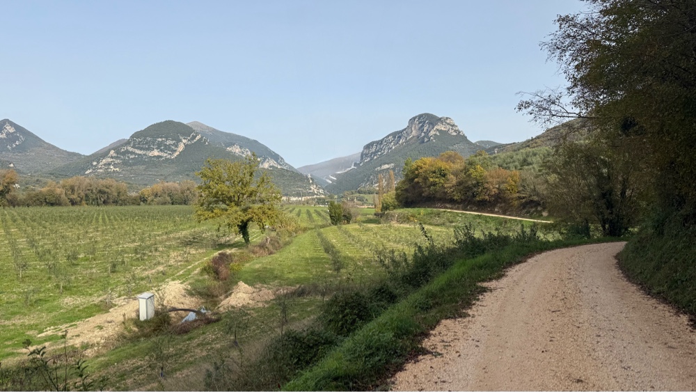 We approached the store through the parking lot and found volunteers running a food donation effort at the entrance. One of the workers greeted us, recognizing our pilgrim status. He was very kind, giving us information and talking about the walking in broken Italian and English. We used the interpreter on our phones to fill in the gaps. It is amazing how the first person you meet when entering a town can set the impression for the whole town. This must be a very friendly place.