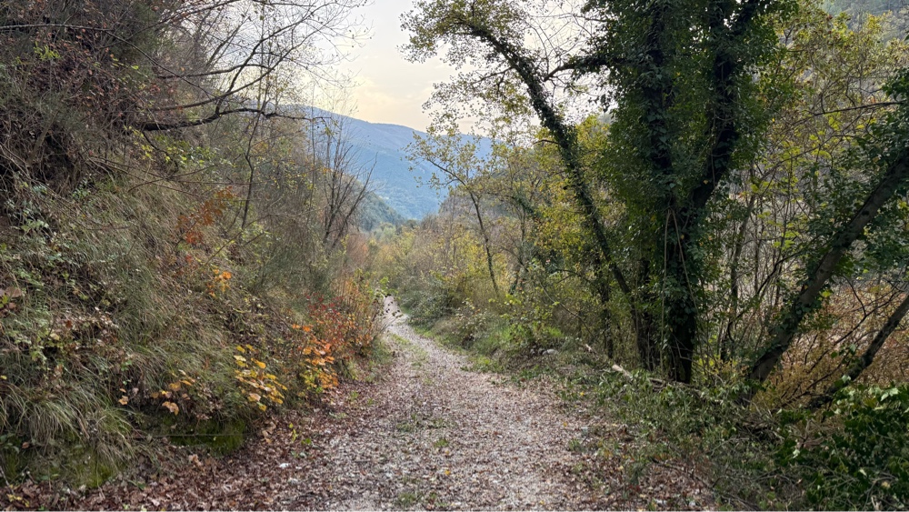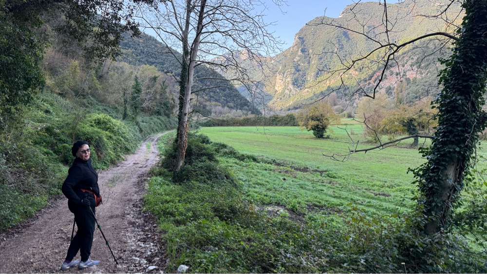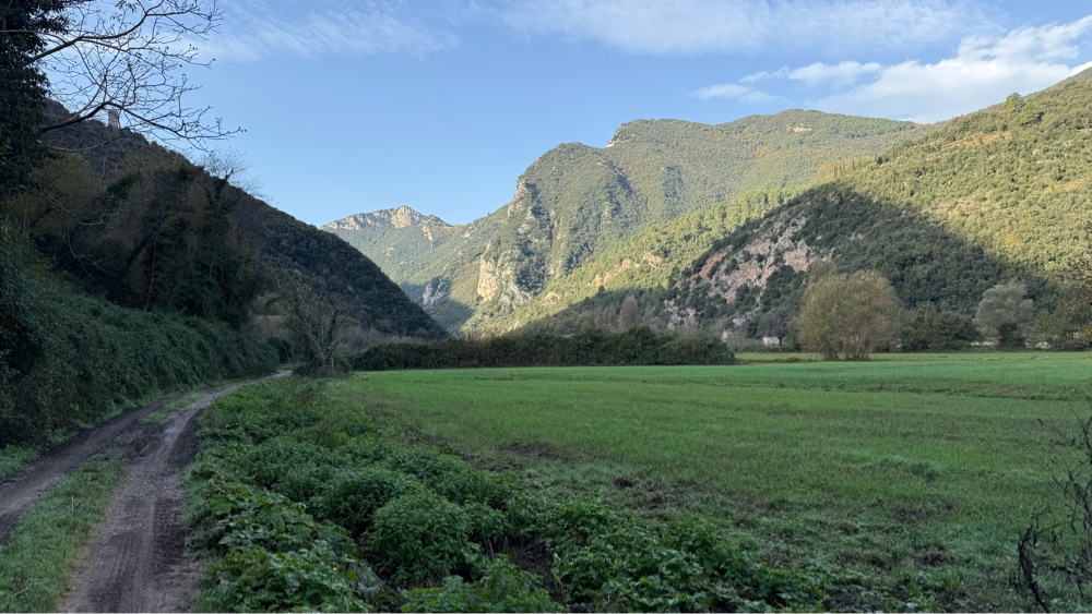 The bus traveled under the mountains we were to hike over in a many mile long tunnel and dropped us in a new river valley. Instead of the flat five mile wide river plain we had been hiking along we were now in a narrow valley with just a hundred yards of flat ground between the soaring mountains, the Nera River flowing swiftly down its bottom. Instead of climbing high up the hillsides of the valley as we had the previous five days we stuck to the river bottom, often only a few feet from the creek which was about 20-30 feet wide, averaging 1-2 feet deep and flowing swiftly.