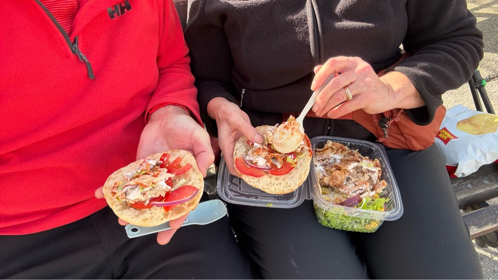 We returned to the store and bought potatoes and eggs to go with the sausage I have been carrying for dinner and some food to give to the food bank volunteers.