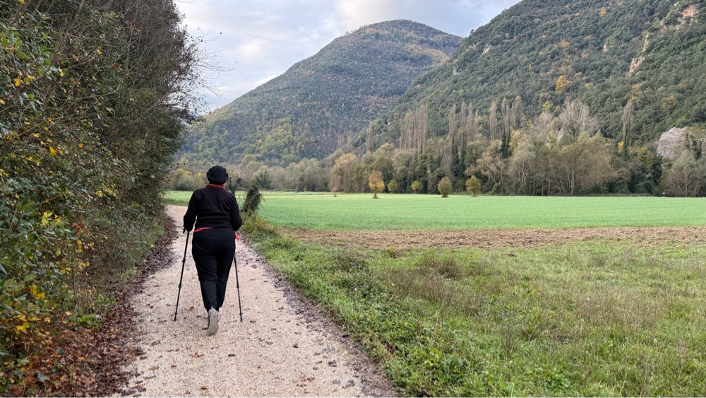 The valley was now about a mile wide. Our path was down a gravel road to the east of the main arterial running up and down the valley. Occasionally we had locals walking or cyclists pass us in both directions. We walked through the northern half of Arrone, getting a bit confused as to our route through town, then walked about a mile further to the southern part of the town where are room was for the night. We turned off our route and walked along the highway, approaching a large grocery store. Our room was just a few 100 yards ahead. Sally suggested we stop and buy food, I thought it best to check in and see what kind of kitchen our room had before we bought food. Wisely, she pointed out it was 12:45 and the store would likely close at 1:00, leaving us without food until it reopened at 5:00. Smart woman I am traveling with.