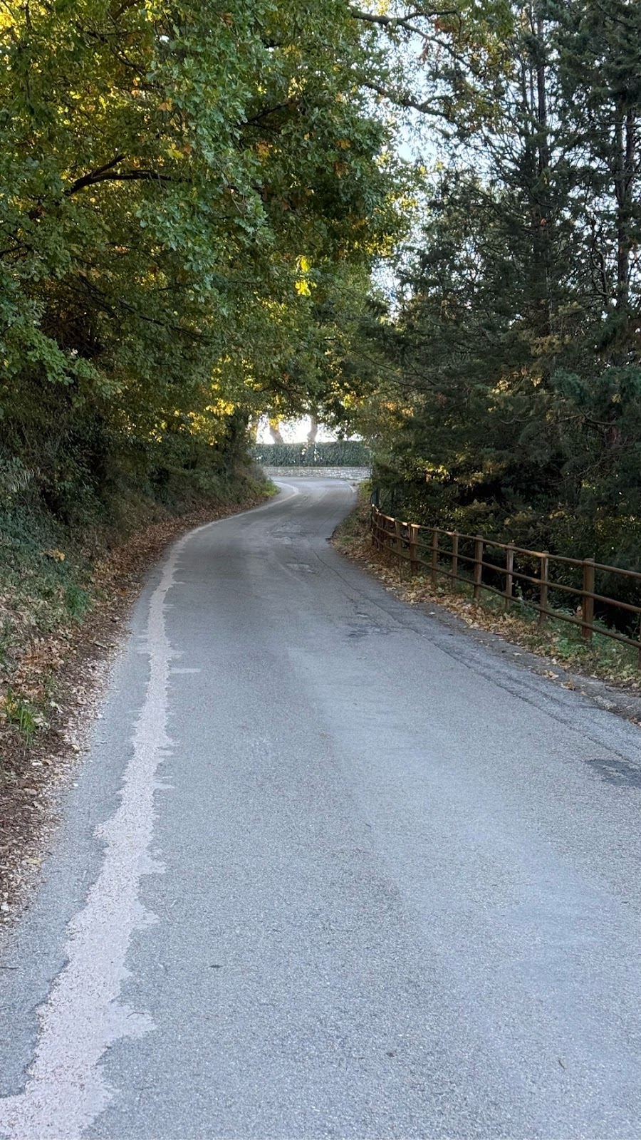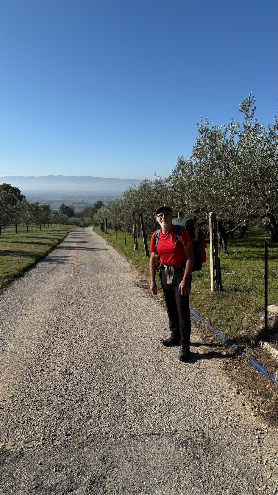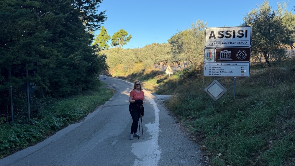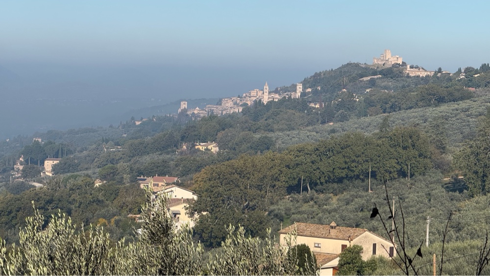 We started out walking through Assisi’s suburbs, traversing Mt. Subasio on residential roads carved into the hill. Huge oak trees provided shade. Eventually we left the suburban area and entered the olive groves, walking paved or gravel one lane access roads. A car passed us on average maybe every 20 minutes? The view off to the right was down into the valley below while Mt. Subasio flanked our left high above.