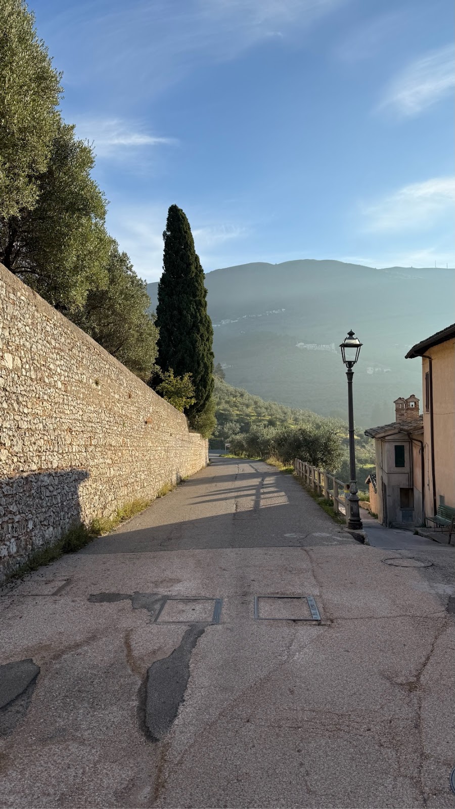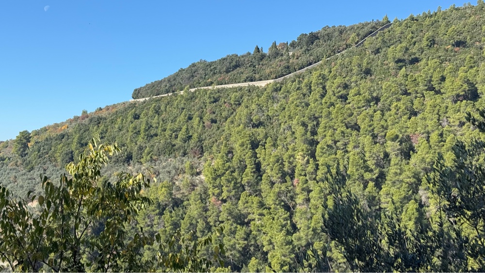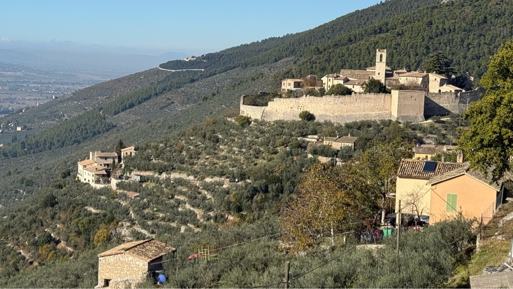 At the top of the climb the road began a level traverse for half a mile and ended at one of Francis’ hermitages high above the valley below. In the intervening centuries it has been greatly expanded with a church and abbey and protective walls. Heavily treed inside the walls and out.