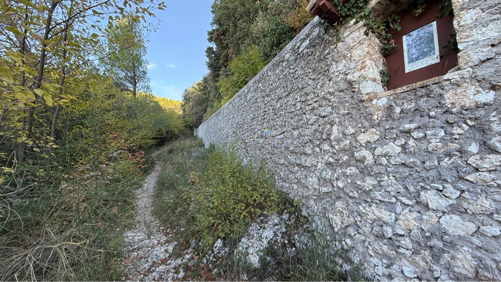Our route took us downhill, paralleling the wall. We had no idea it was this big. Massively tall and going on forever. When we finally reached the low point of this circling barrier our trail dropped straight downhill, leaving behind our cloistered nuns. We could hear a chainsaw in the distance behind the wall. Probably why they couldn’t hear the dog.