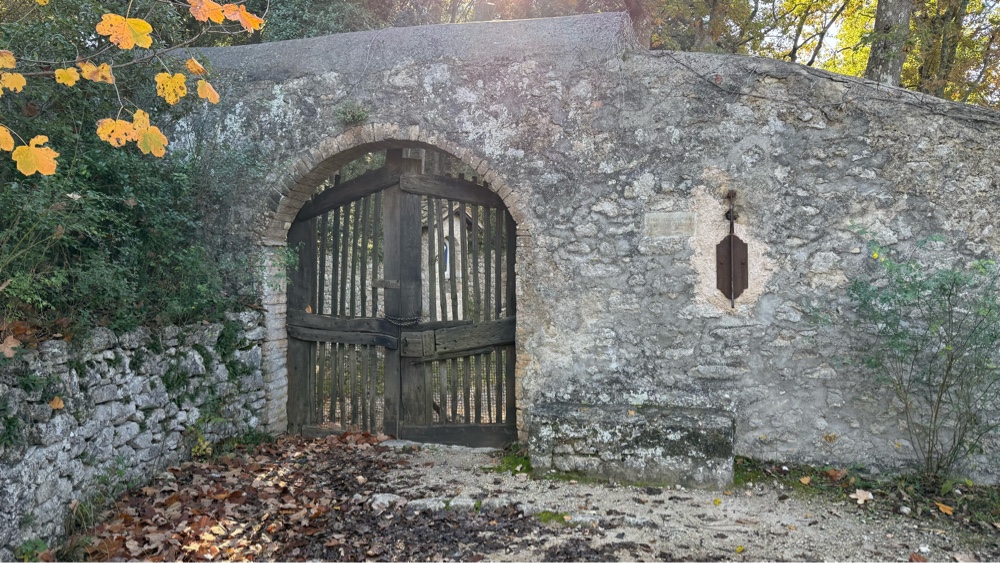 The arched entry had a wooded gate chained shut and an annoying, loud dog barking continuously. There was a mechanism to ring a bell to alert the nuns inside they had visitors. We were loath to ring the bell, figuring if they wanted visitors they would have come from the racket the dog was making. We could see the abbey about 100 yards away inside the magnificent grounds behind the gate but no activity. We decided to let them be and turned downhill and away.