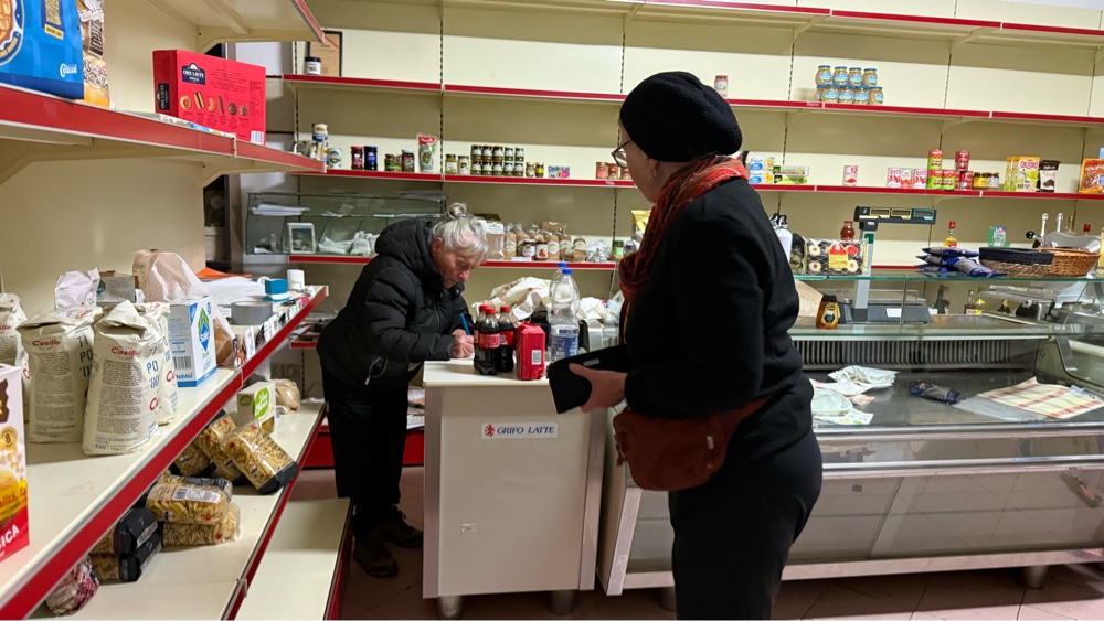 At 6:25 I turned on the feeble light outside the villa door and anticipated the arrival of Rosa. Nope. At 6:40 my phone rang. She said the food was ready. I hustled over to her store again. She had a large serving bowl full of pasta immersed in tomato sauce, our meat and cheese, oranges, packages of crackers and napkins all in a shopping bag for me to carry. She totaled up our previous unpaid purchases and the meal. €33. I gave her €35, thanked her profusely and left. A few steps away I realized I didn’t have her photo, returned and asked if it was okay to take a selfie with her. She said okay. On my way back to the villa I couldn’t stop laughing. This arrangement and situation was so improbable, so quaint, so charming. A mid sixties woman goes home and cooks a pasta meal for us and delivers it to us in a bowl, in the dark without speaking the same language in a villa in a deserted tiny hamlet in the Italian countryside. This is what we came here for.