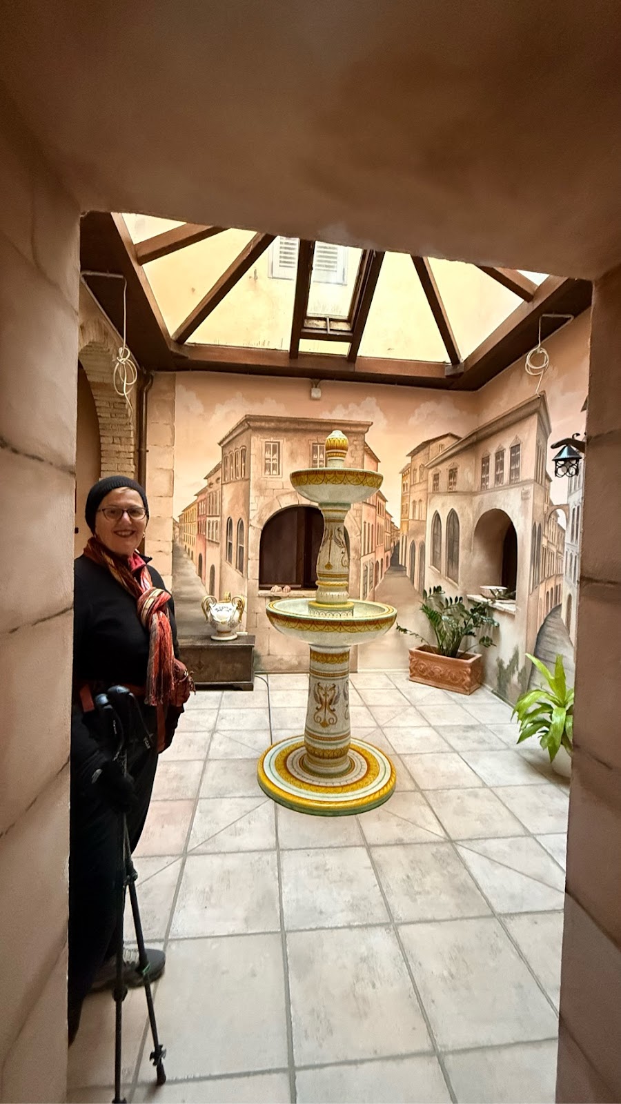 Breakfast is served here at Hotel Trevi, and it is a good thing. Last night’s dinner was quite sparse due to lack of groceries and restaurants And lack of cooking facilities in our windowless hotel room. Breakfast started at 7:30 and we were there in the ancient road bed with vaulted arched roofs converted to an elegant if not a bit oppressive dining room to take full advantage. Cereal, yogurt, bread, croissants, juices. Delicious. We were eating to make up for our lack of dinner yesterday. As we were nearing the end of our meal the young woman attending us brought out two slices of a cheesecake like desert covered in berries. Groan. If we had known that was coming we might have tempered our eating. Too delicious to leave. We delightedly consumed it.