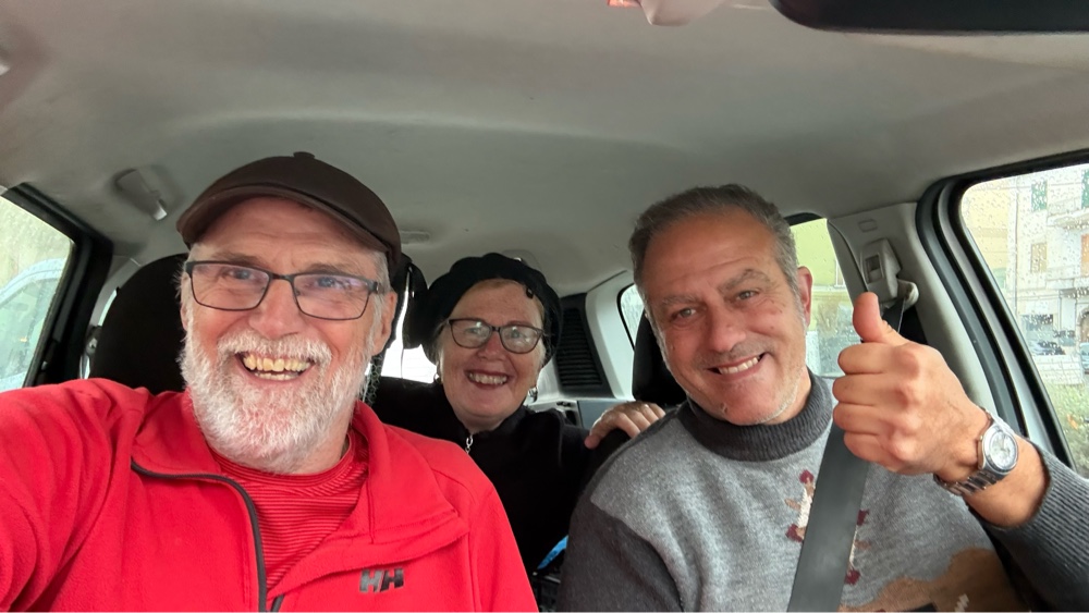Sally’s immediate response, We’ll hitchhike! She took a step forward and put her thumb out. I joined her. A skeptical lady drove past but the next car stopped in the middle of the road and rearranged the junk in his car to allow us to sit, me with my pack on my lap in the front, Sally in the back. We introduced ourselves. This was Antonio. At first he wanted to know why we were walking back to San Lorenzo, not really believing what he was hearing. As we drove slowly (by Italian standards) toward Poggio Moiano we talked and got to know him a bit. He was on disability, both kidneys having failed, doing dialysis. He had a friend (girl, but not a girl friend) from New York living nearby who he thought we should get a chance to talk to. When we got to the plaza in Poggio Moiano he called her a few times, but he had warned us she liked to sleep in. He had us take his number and told us to call if we needed anything, ANYTHING. He was soft spoken, kind, etc. All the traits I listed in my introduction, the same as the umbrella lady at the train station and the bus driver that gave us the ride for free. Sally proffered a €10 note from the back seat and told him to take his lady friend to lunch. He refused, repeating in English, “Free. Free”. People are amazing.
