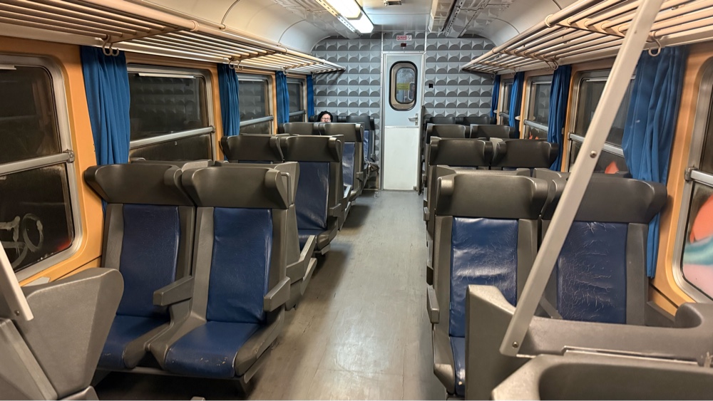 Our train rolled in on time, track 2, and we stepped across track one to get to it. It was more like a bus on the tracks. A single train car, self propelled. We were the only ones boarding it and there was no one on board.