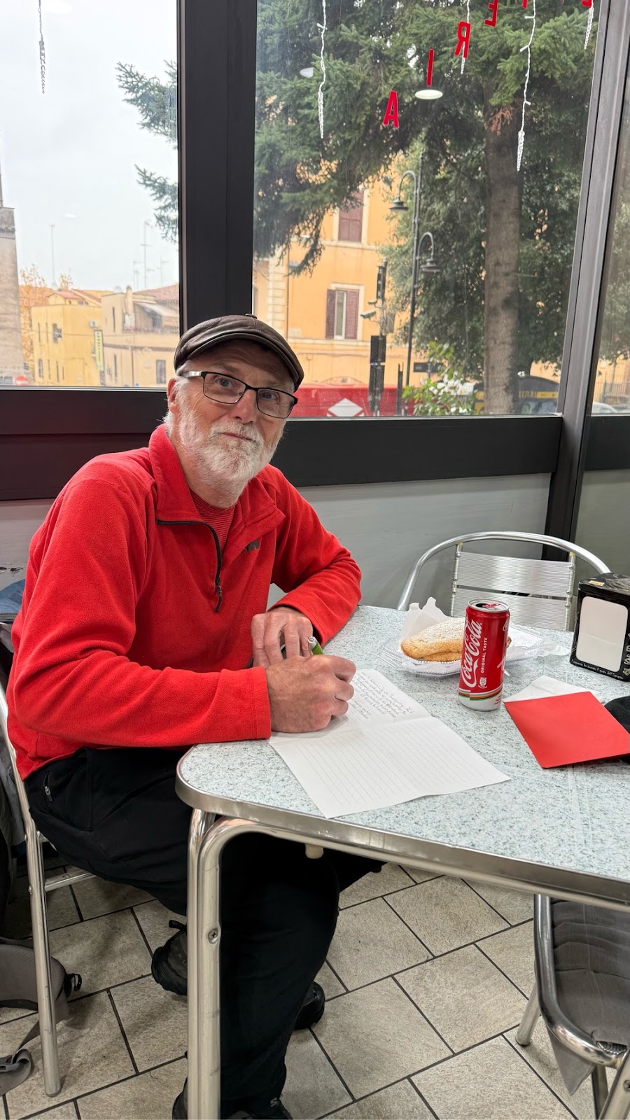 Writing letter to Rob, Junie, Izzy and Sammy in Monterotondo cafe while sitting out the rain.