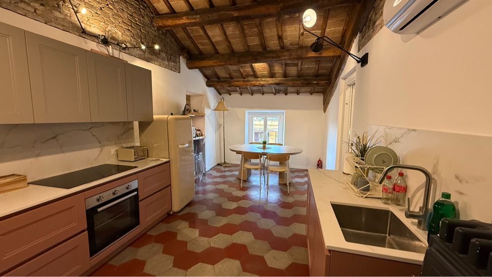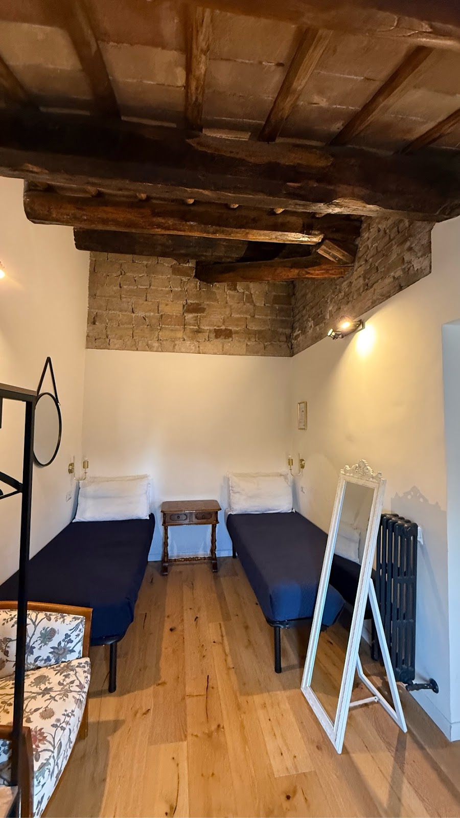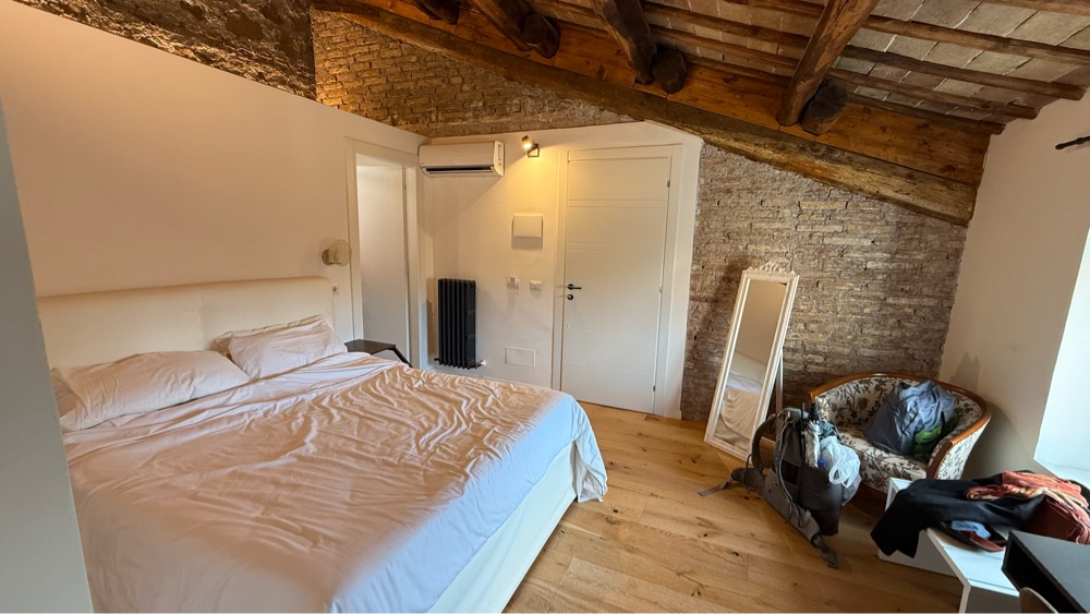 Our apartment is spacious, with two bedrooms, one with a queen bed and one with two singles. It also has a large bathroom. It has all been beautifully redone. We asked about it before he left. It was his wife’s grandfathers place, handed down to her. They ripped out the interior, exposed the timber supported ceiling and brick walls and then carefully crafted an aesthetically pleasing space highlighting the timbers and brick with light. Very comfortable, too.