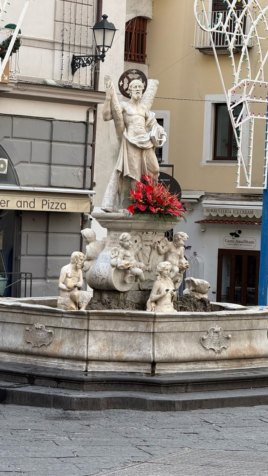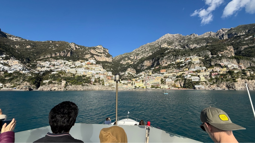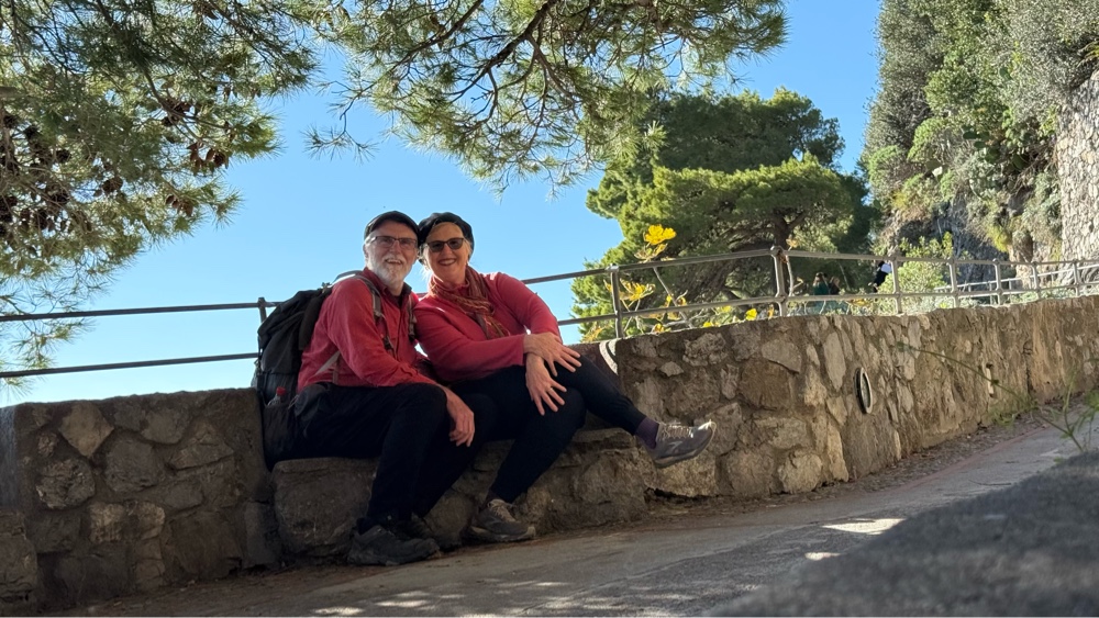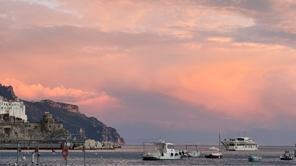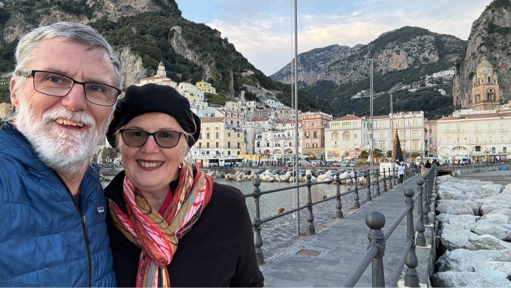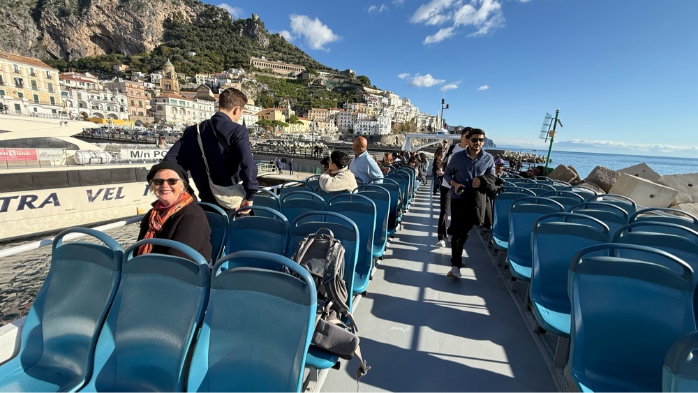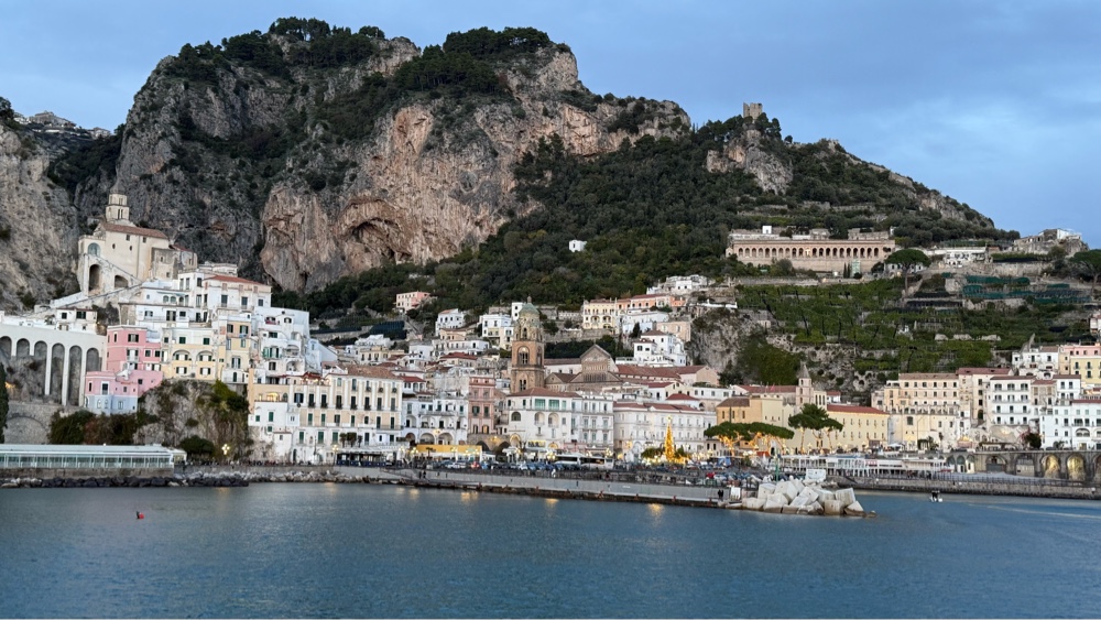 What a glorious morning!! The sun is shining brightly, low on the horizon having just appeared on this crisp last day of November. We are down on the waterfront/bus depot early, hoping to get a prime seat on the bus that will ply the Amalfi Coast road back to Salerno. There are a number of buses parked at the station. It is 7:30am, 30 minutes before the scheduled departure time. We notice a couple drivers hanging out in a bus talking. They open the door as we approach. Upon inquiry they tell us the bus we want will be parked right in front of them in a few minutes. True to form, it arrives in about ten minutes. In the meantime we mill around the square admiring the morning, the position of the town, the cool air, the rocky mountains above and contemplate how to capture the morning with our cameras. The morning sun casts a golden glow across everything, the faces of the buildings, the cliffs, the statues in the square. It is that magical time of the morning. After a few feeble attempts we give up. There is no way to capture this moment in time, bottle it and take it with us. We will just have to trust our aging brains to remember the look, taste, sound and feel of the morning.