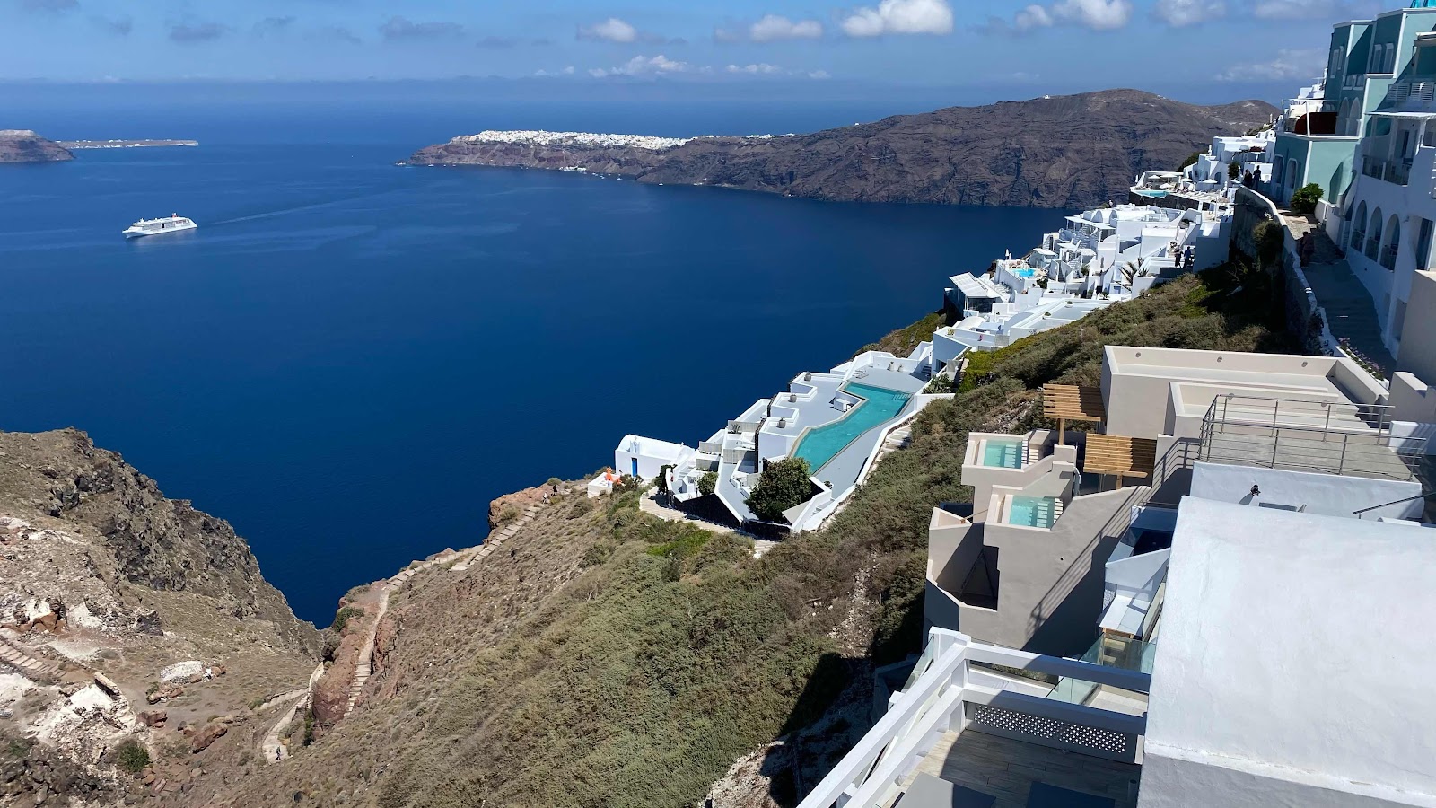 This is a beautiful walk, not through nature as we think of it with rocks and birds and animals, but through whitewashed high end hotels and restaurants clinging to the ridge tops and cliffs. Instead of birds fluffing their feathers and doing elaborate dances to attract mates, we found hotel and restaurant employees cleaning hot tubs, fluffing pillows, whitewashing walls and sweeping walks in an attempt to lure in customers. A vain exercise as there simply are not any on the island, at least not enough to fill the thousands of vacant rooms and restaurant chairs we see.